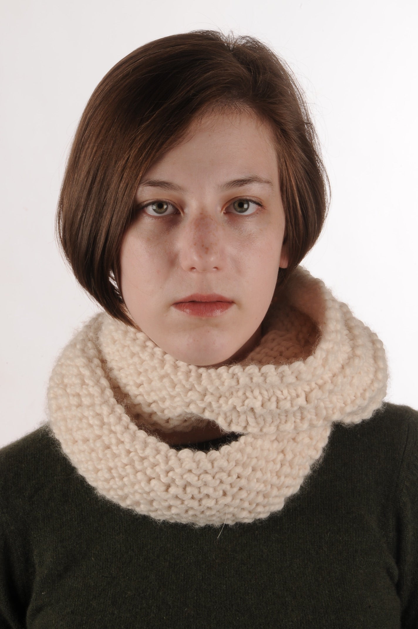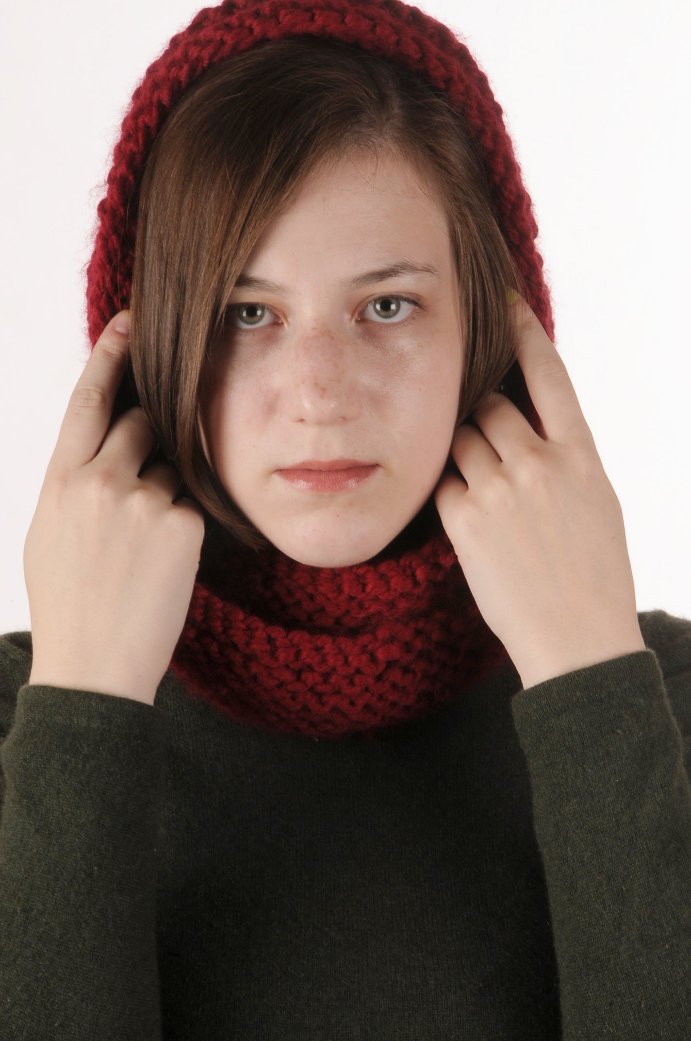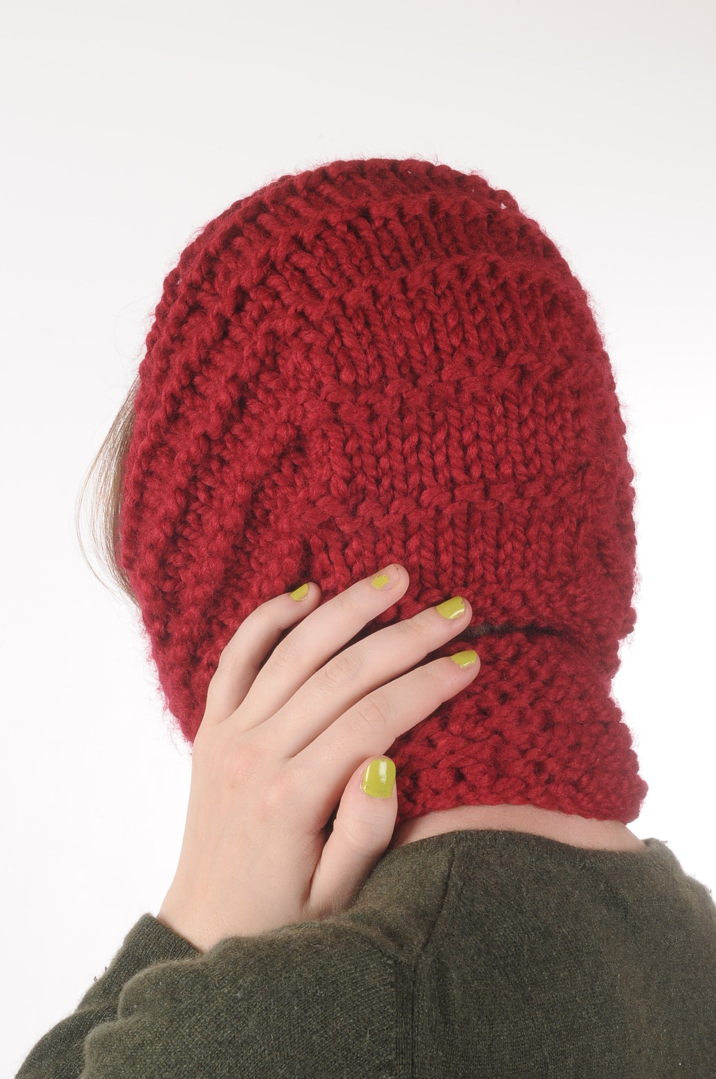 Combination cowl, hood, hat pattern knit in the round. This is a very fast one skein project.