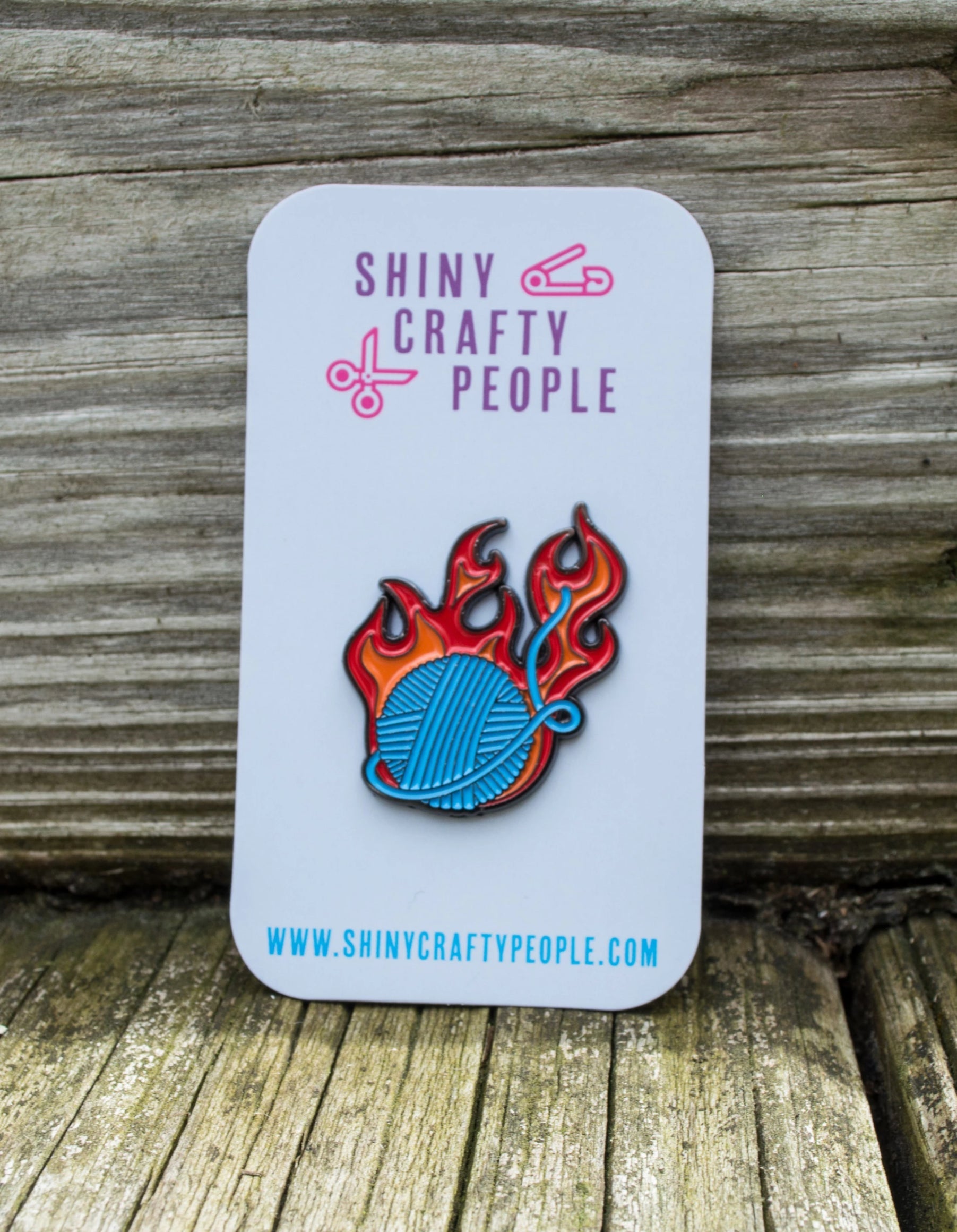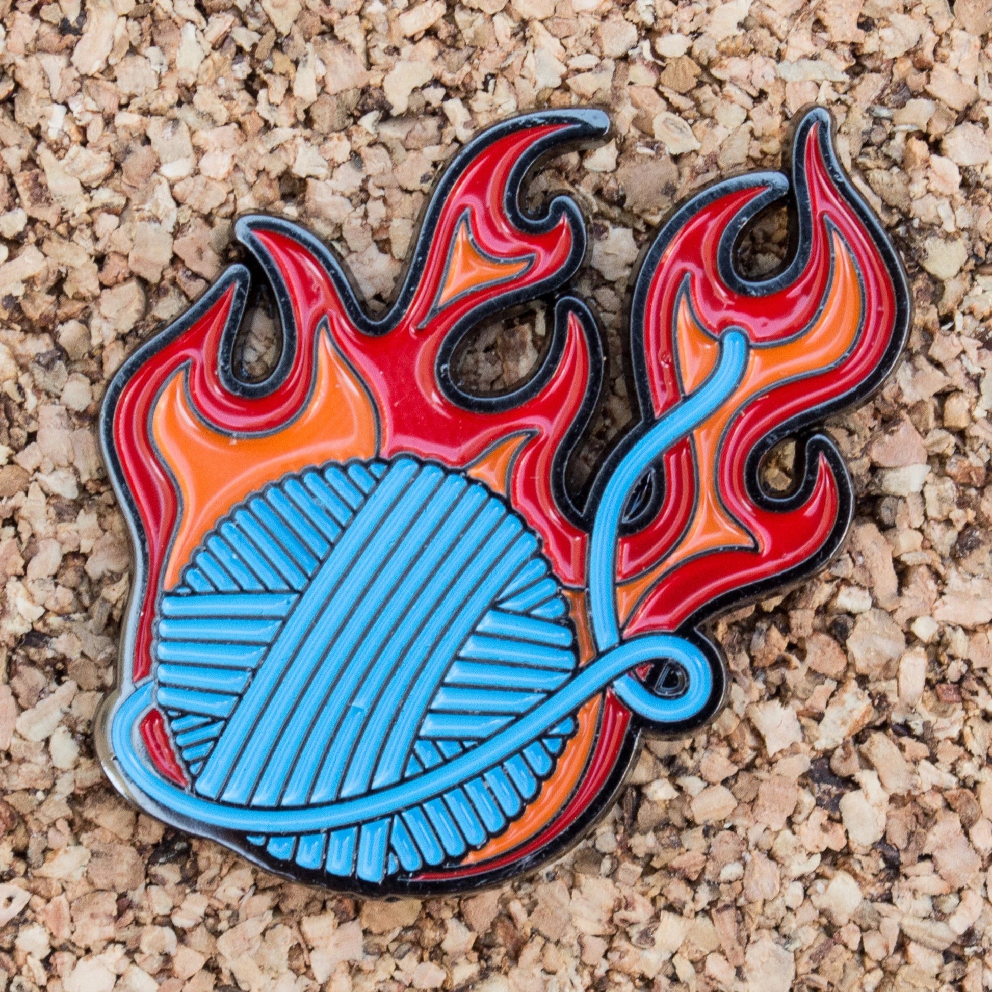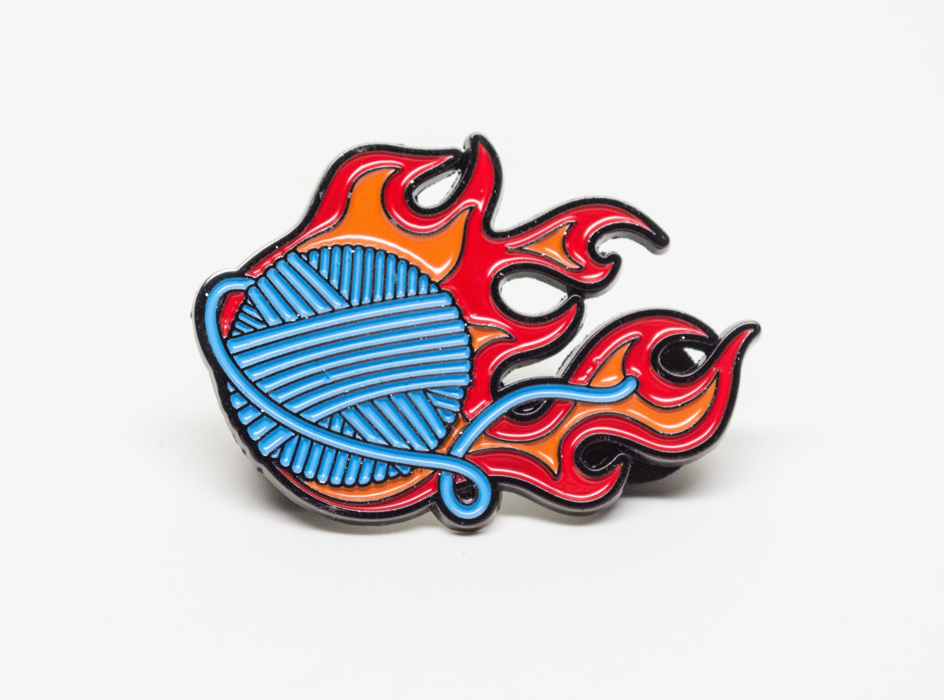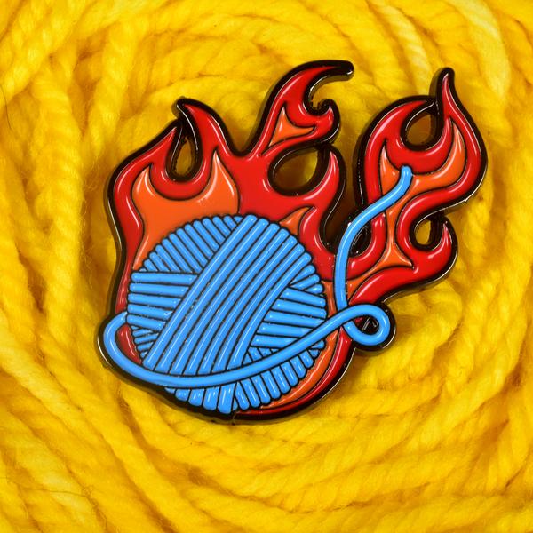 Goodness, gracious, yarn balls on fire! Whether your stitches are smokin', you love hot colors, or you simply enjoy classic rock jokes, this pin is sure to make a statement.