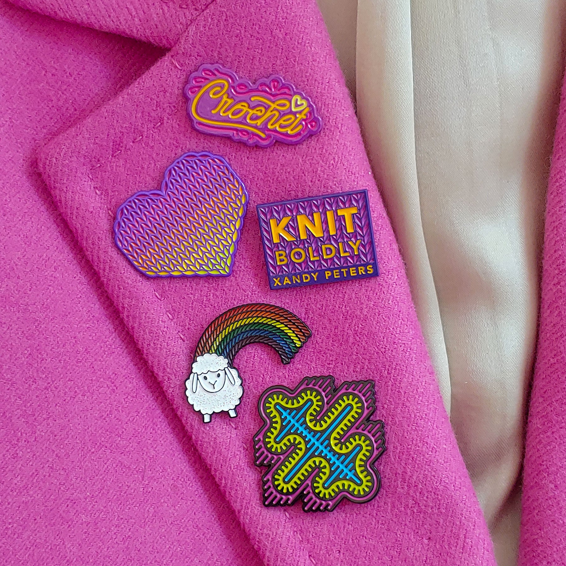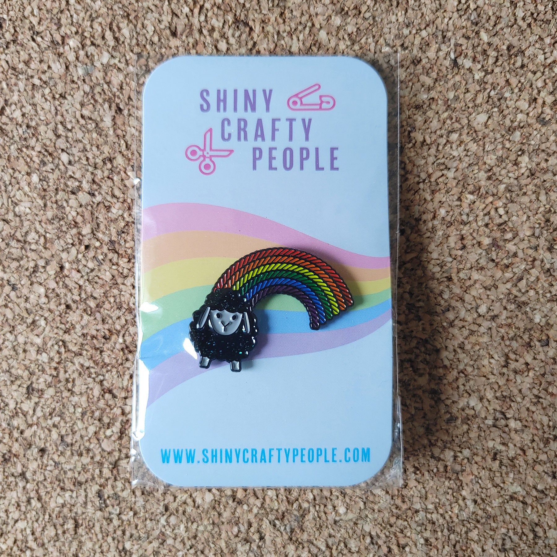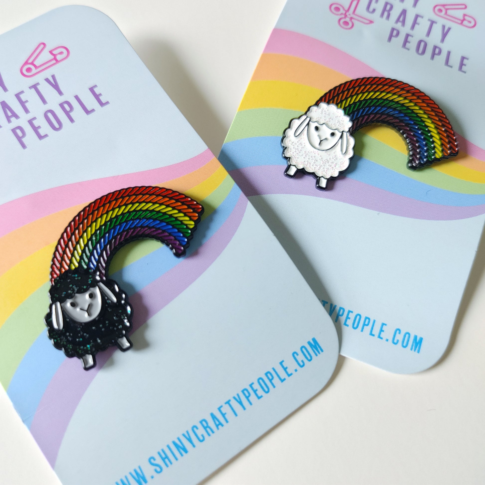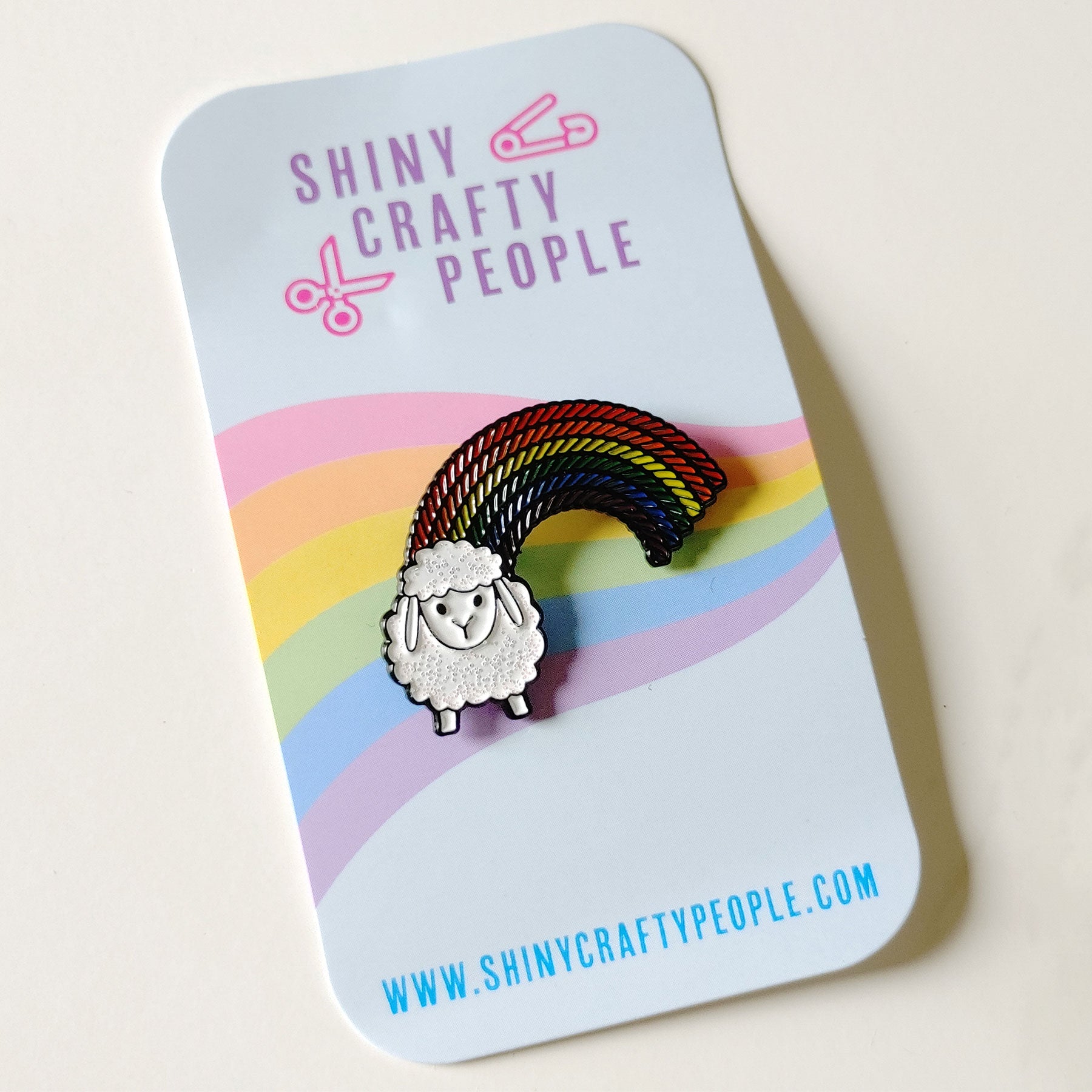 Our LGBTewe (it's a pun, get it?) pin envisions a world where there's a shiny sheep at the end of every woolen rainbow. Six strands of yarn form a rainbow, ending with a fluffy, sheep-shaped cloud.