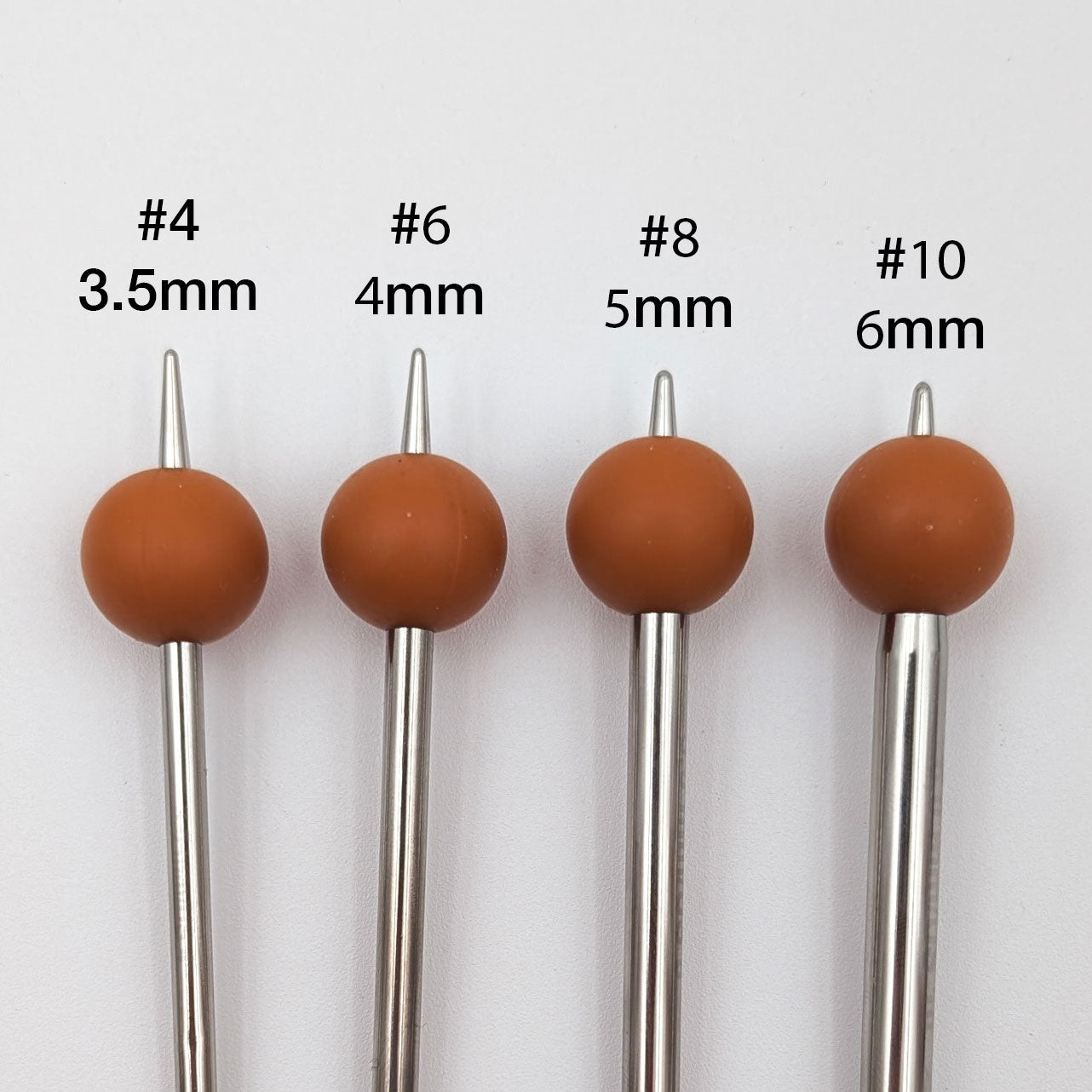 Note: I find that the larger stoppers work best with smaller needle sizes and small stoppers stretch more easily to fit needles with a larger diameter. Consider getting a set of Small Spheres or Flying Saucers if you tend to use size #6 (4mm) and above