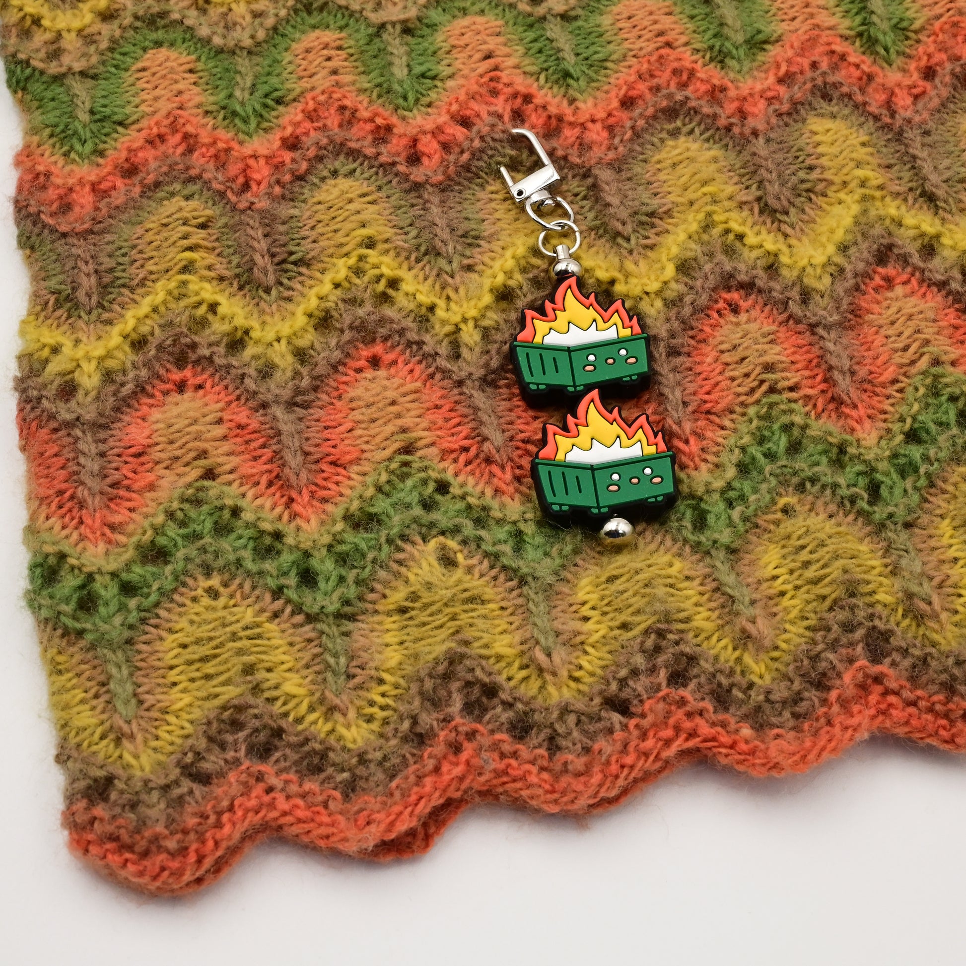 This pair of dumpster fire silicone needle stoppers is the cutest way to keep your stitches safe and secure in your knitting bag. When they're not in use you can use the silver stopper keeper to make sure your stoppers stay attached to your knitting bag or project. These stoppers fit Size #0-10 (2-6mm) needles.