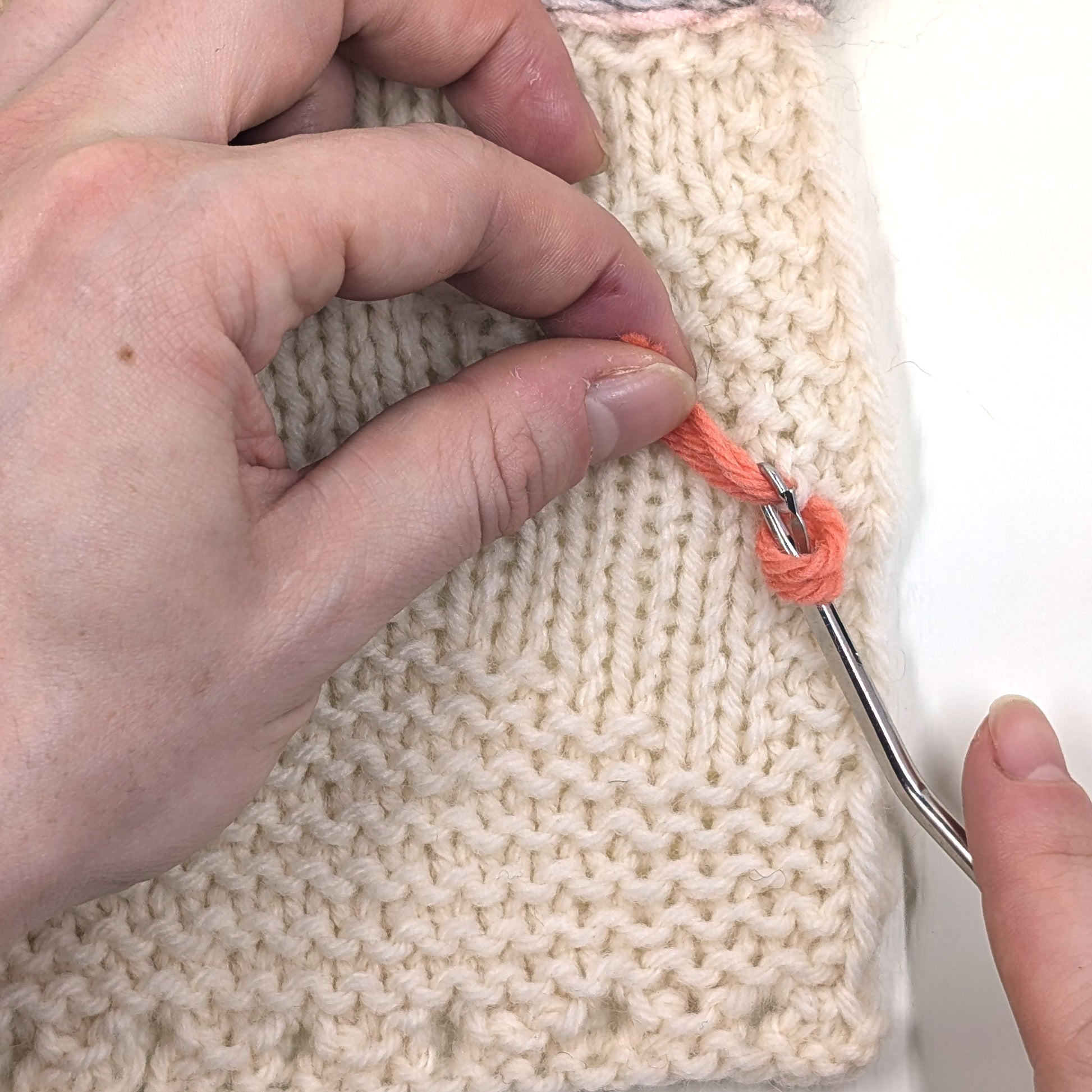 - #7 (4.5mm) needles, exact gauge is unimportant. Fabric should be sturdy and not overly drapey.