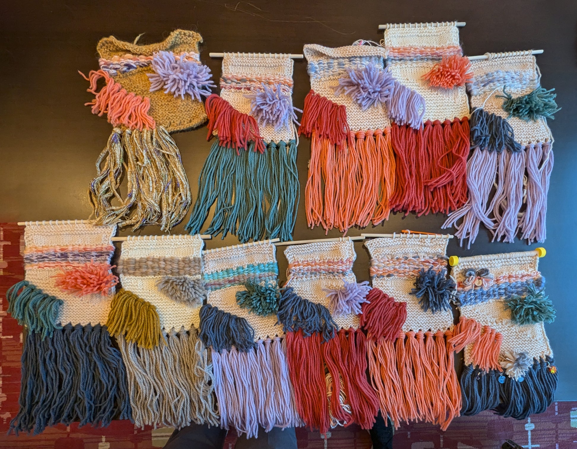 Finished Size: Knit piece is 6.5" (16.5 cm) wide and 8" (21 cm) tall before addition of dowel and fringe. With dowel and fringe, piece measures 16" (41 cm) tall