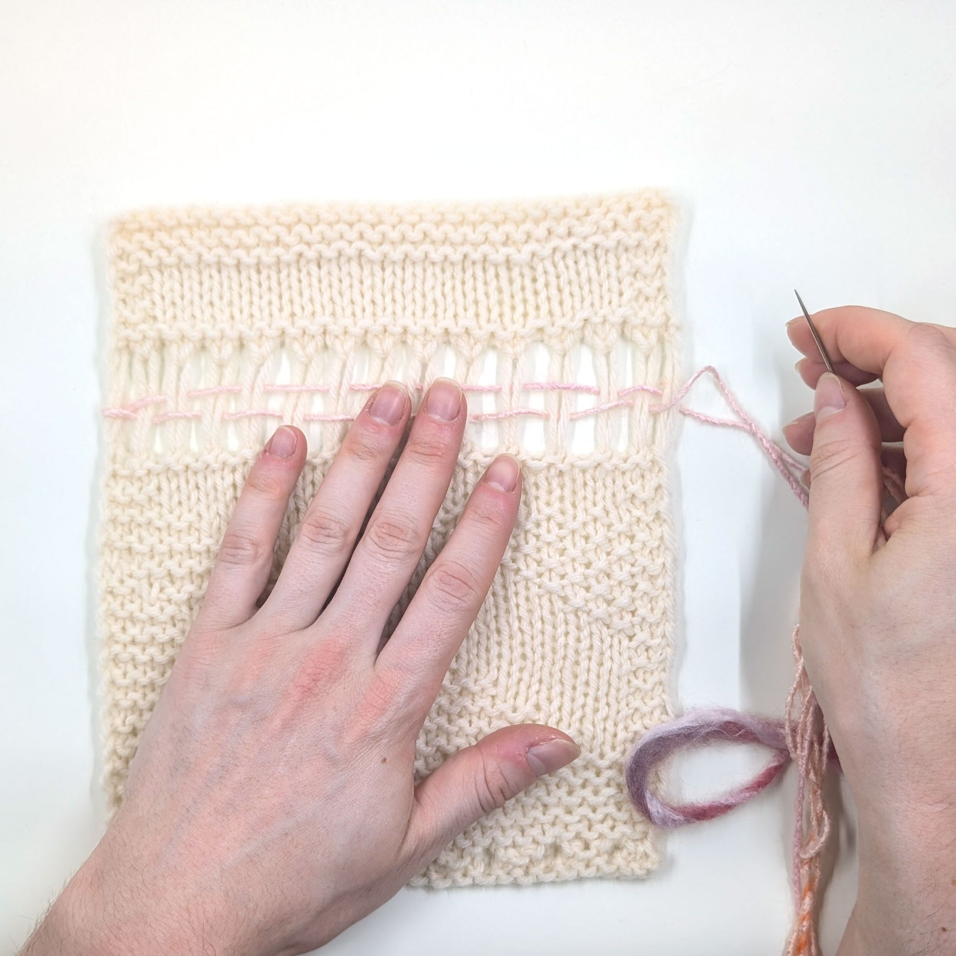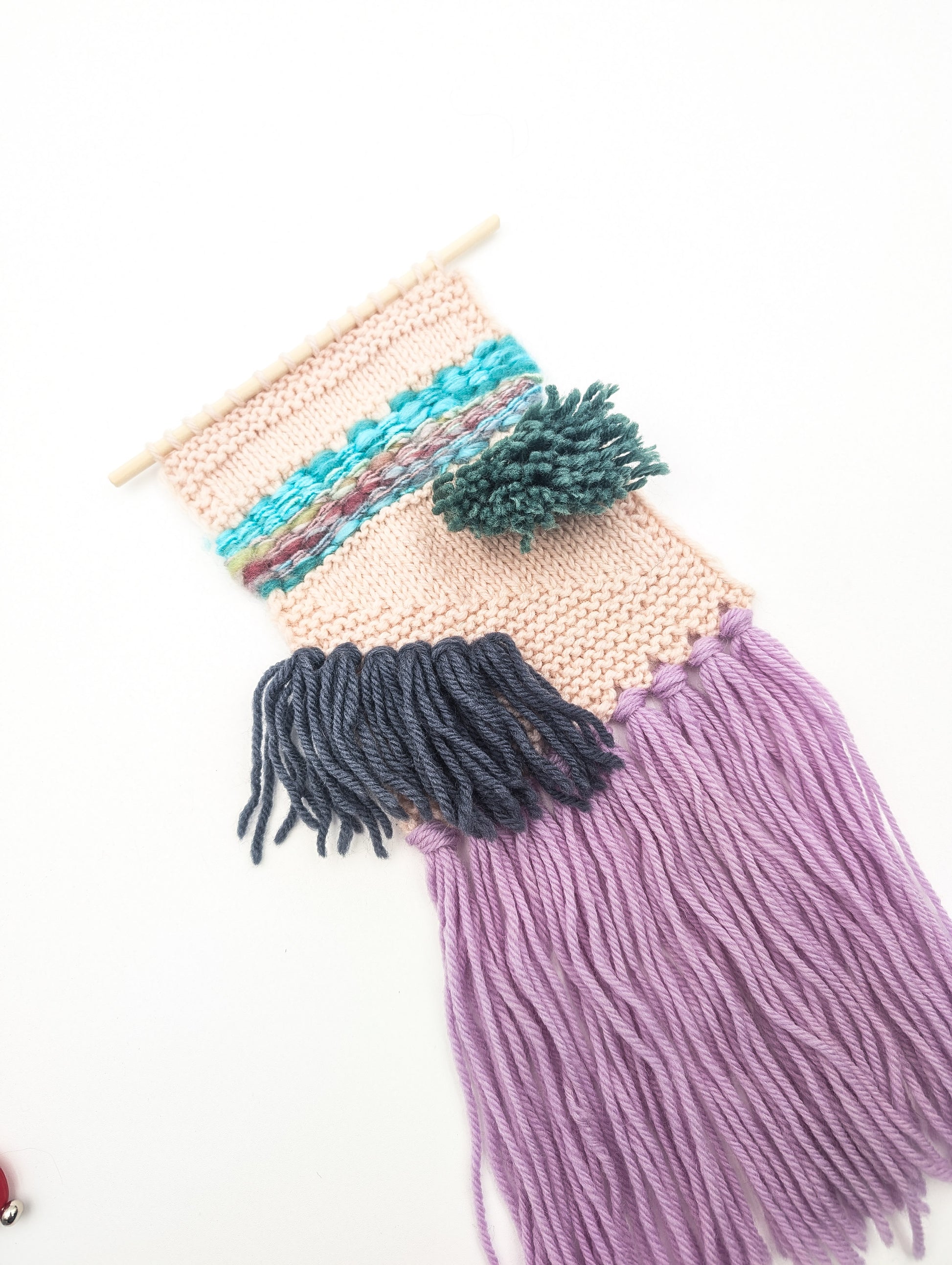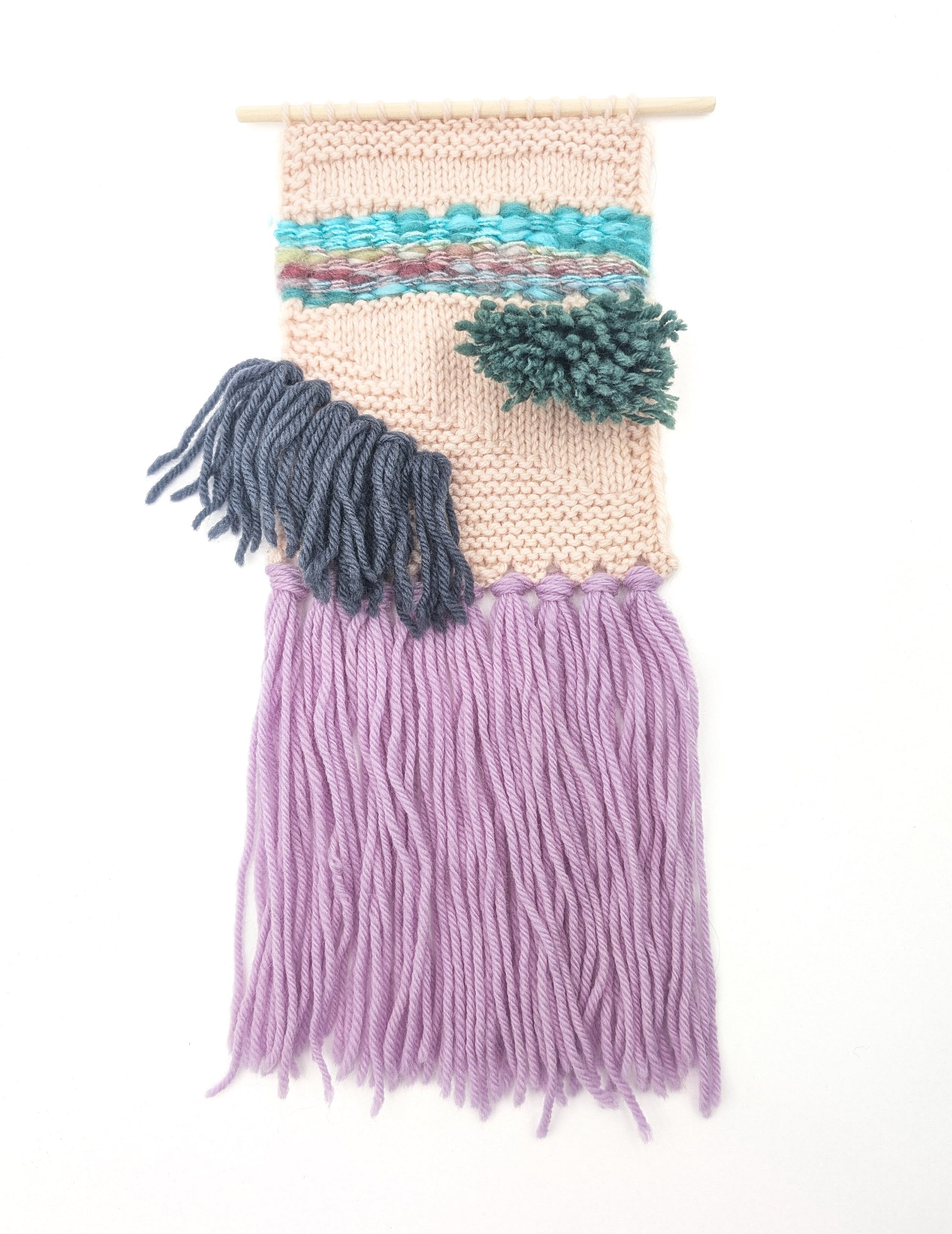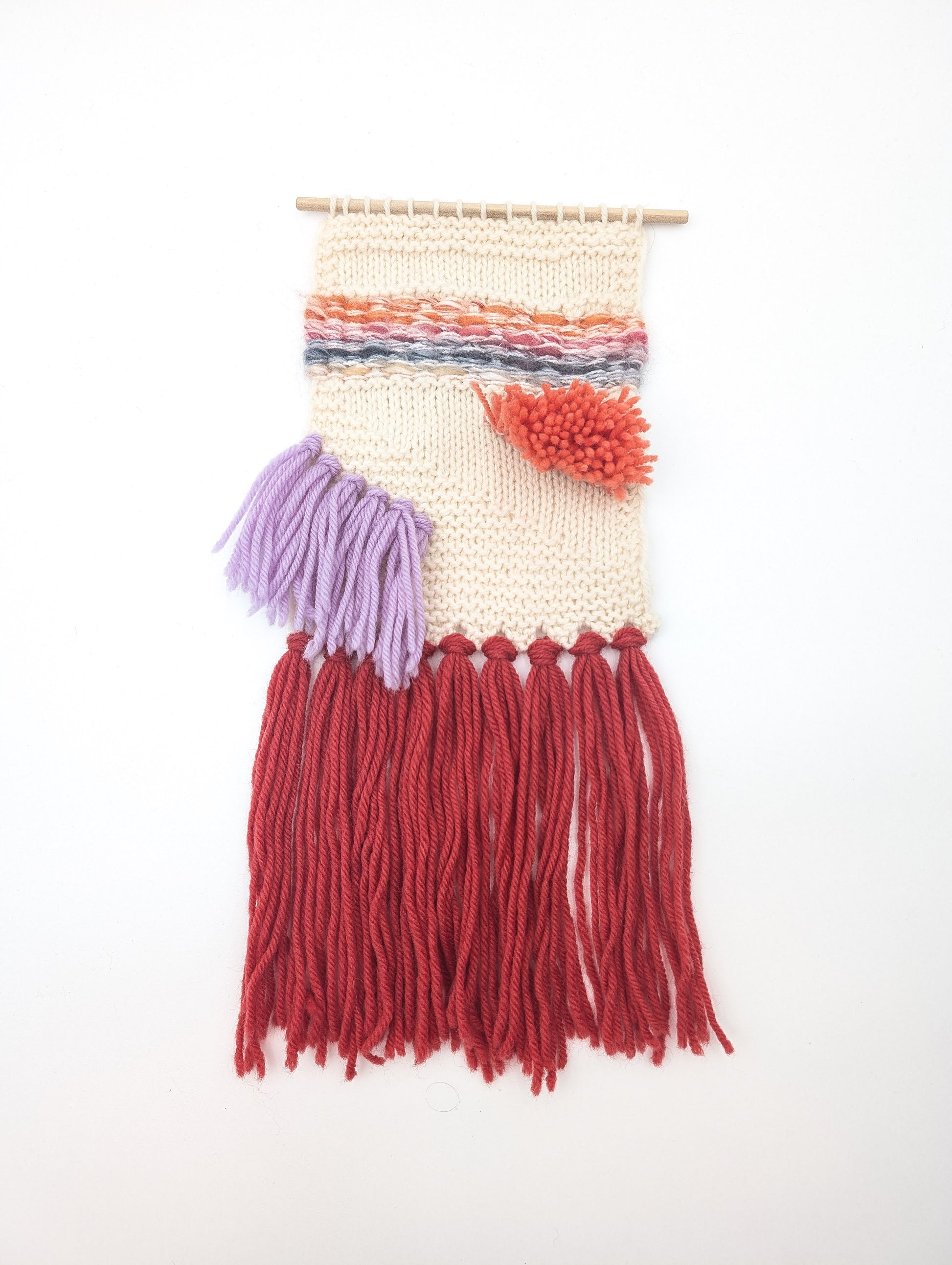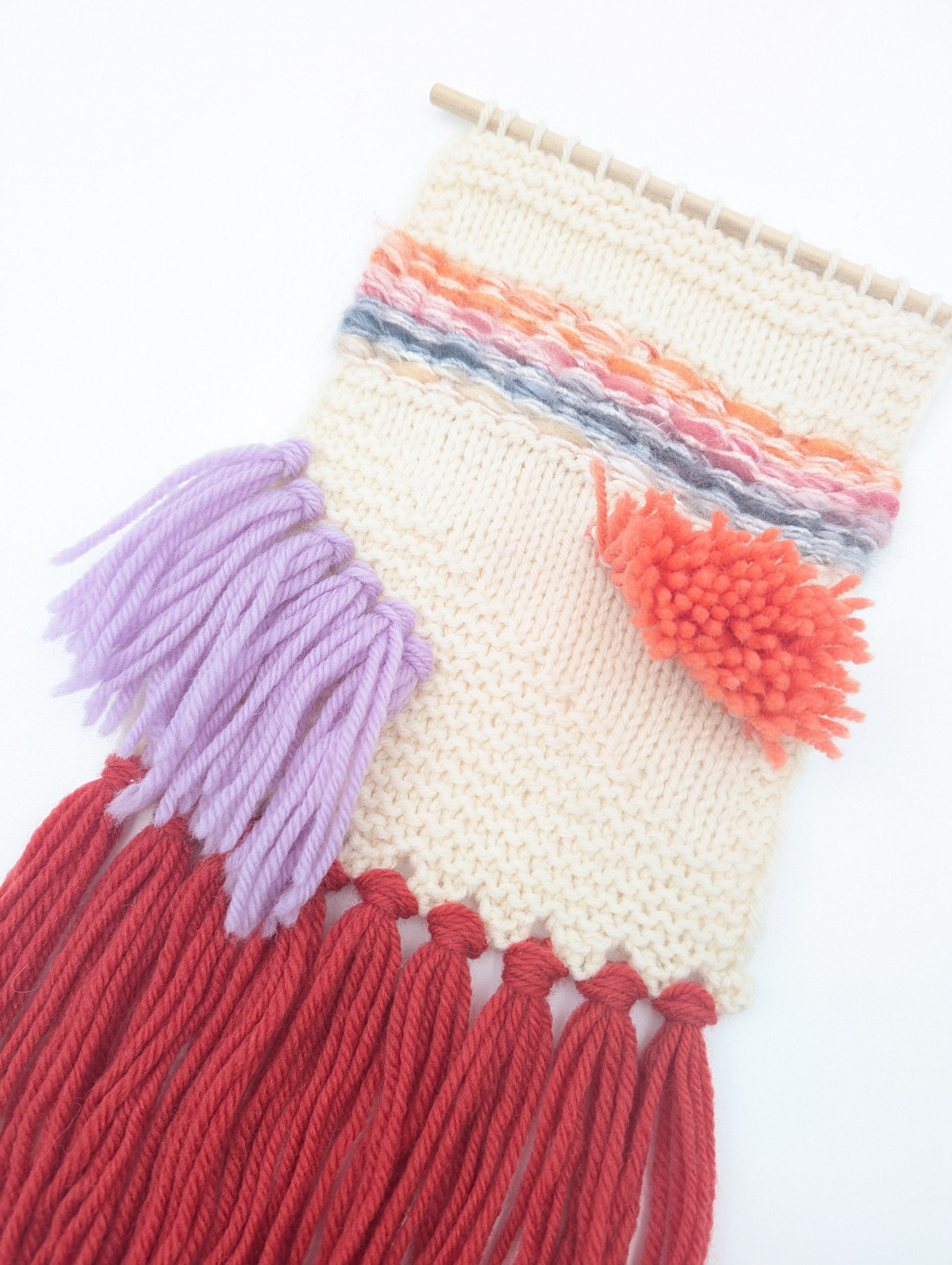 This simple tapestry project is a great way to learn different methods of applying fringe to your work. The knitted part of the project is completed first, then fringe and woven elements are added in contrasting colors. 3 types of fringe are applied to this project and a dowel is added for easy hanging. The pattern includes photo instructions to make fringed elements easier to tie.