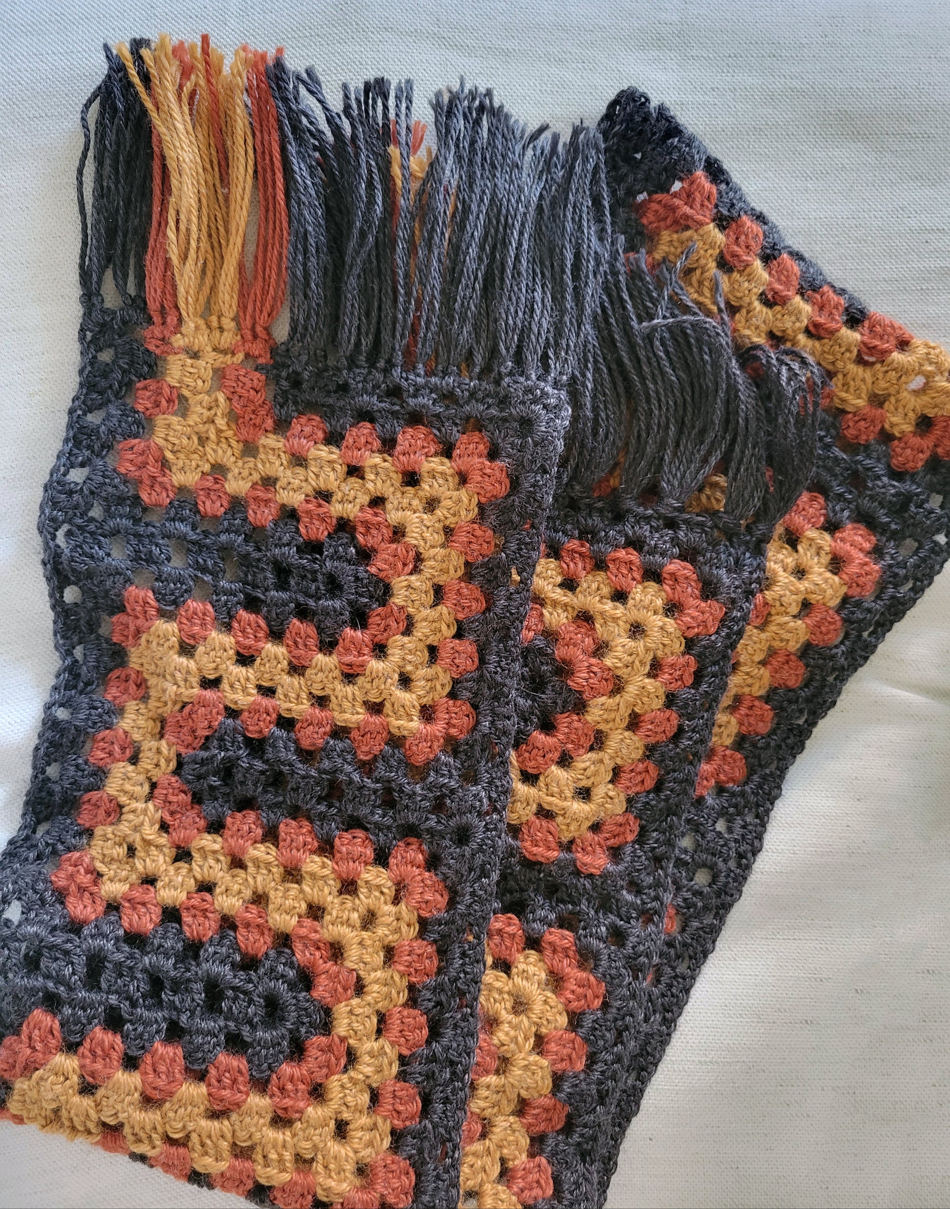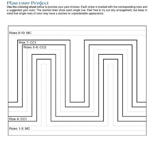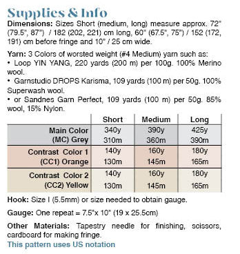 The pattern is worked in a Main Color and 2 contrasting color yarns. You can read more about quantities in the Pattern Info section below. Each end of the scarf is embellished with a generous length of fringe, continuing the stripes all the way to the ends of the project. There's a lot of room in the pattern to play with color, we even included bonus instructions for a two color version.