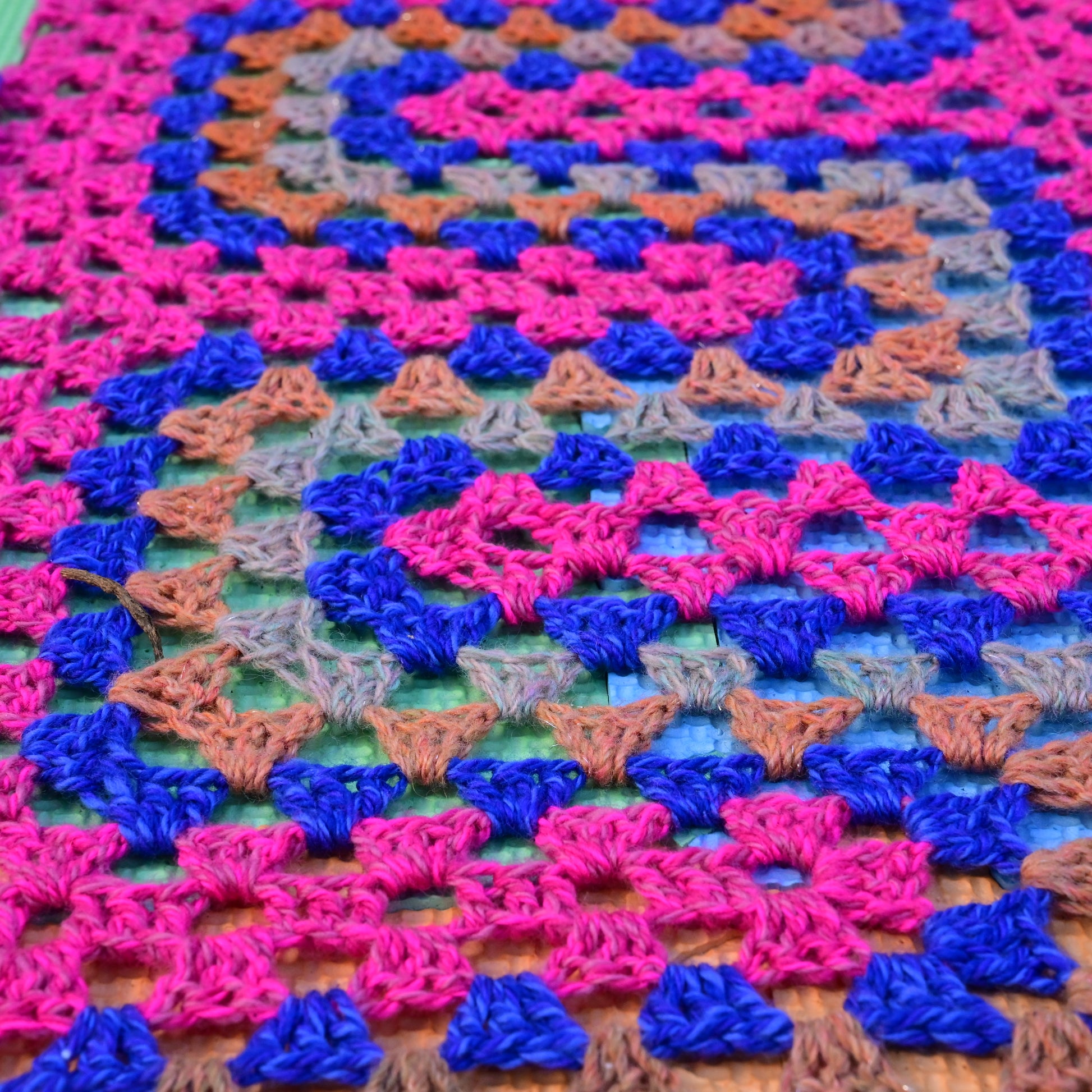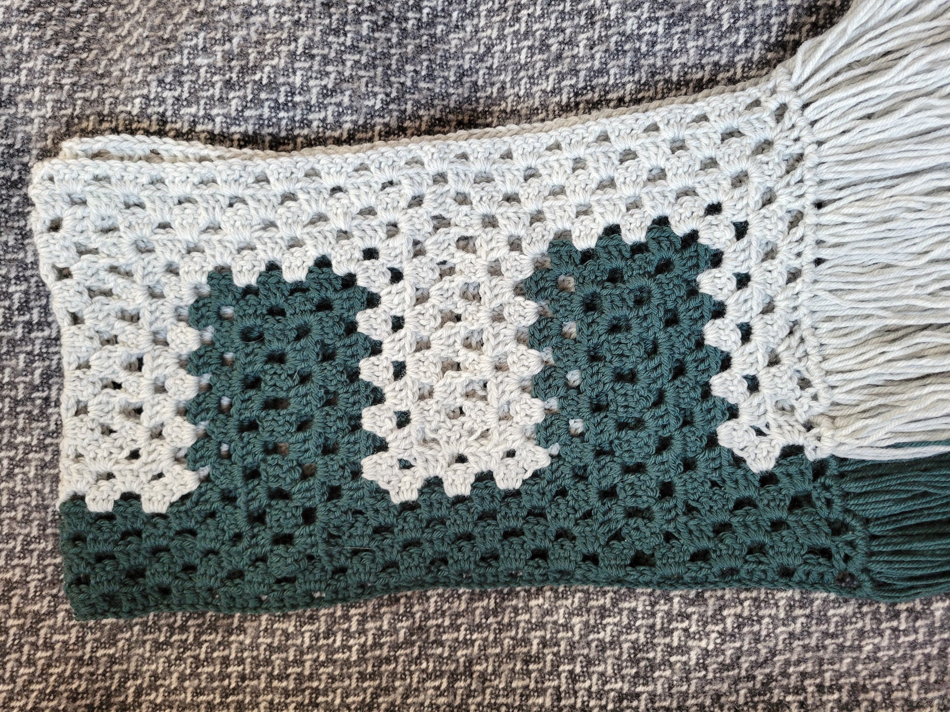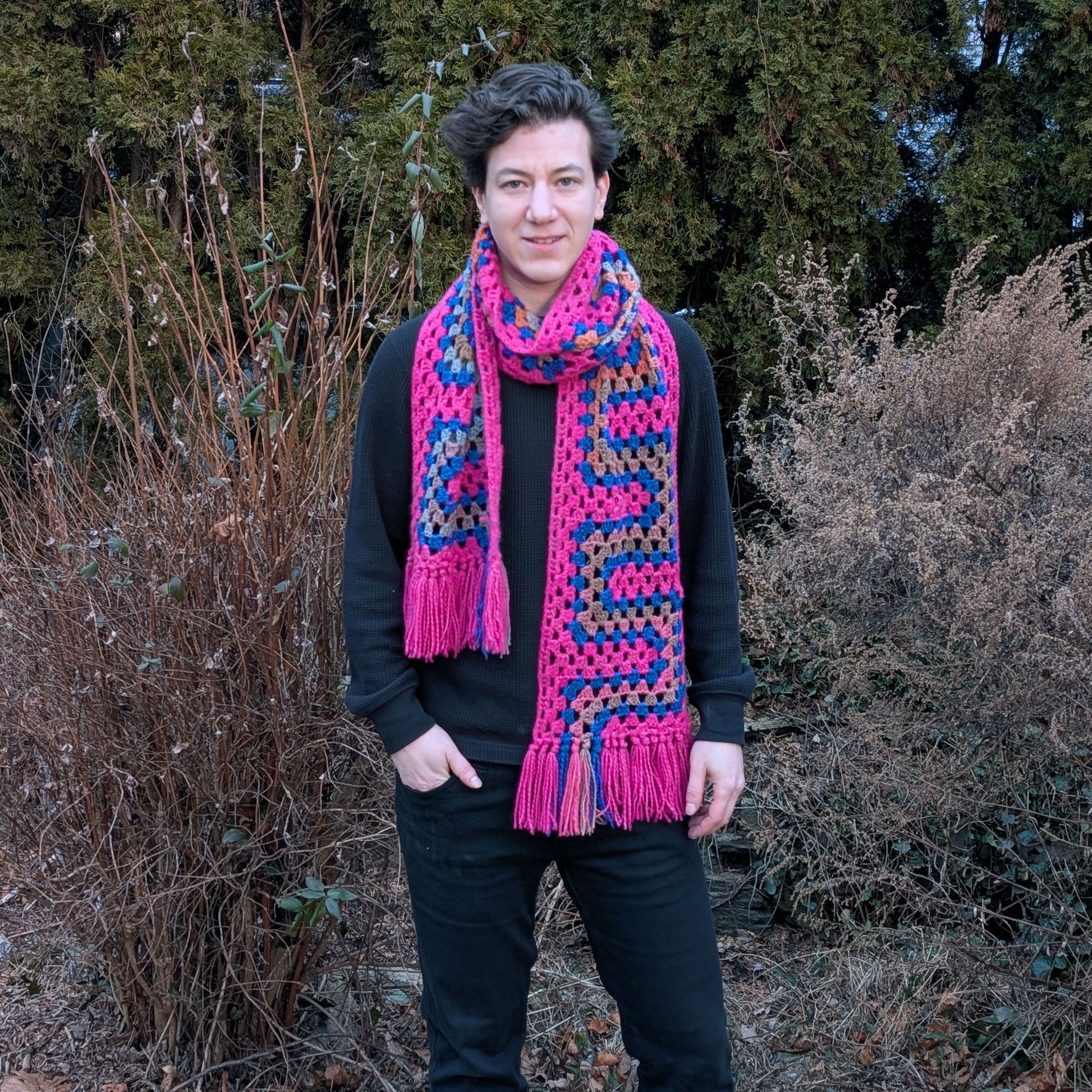 The Stacktangle Scarf is a new crochet pattern from Patrick Stewart and Xandy Peters. This scarf is worked horizontally in a granny stitch pattern. The inclusion of stacked increases and decreases turns simple stripes into complex looking colorwork. Pat and I based this pattern off of our earlier Stacktangle Blanket collaboration. The charted and written instructions include 3 different lengths and it's easy to make adjustments to the stitch count.