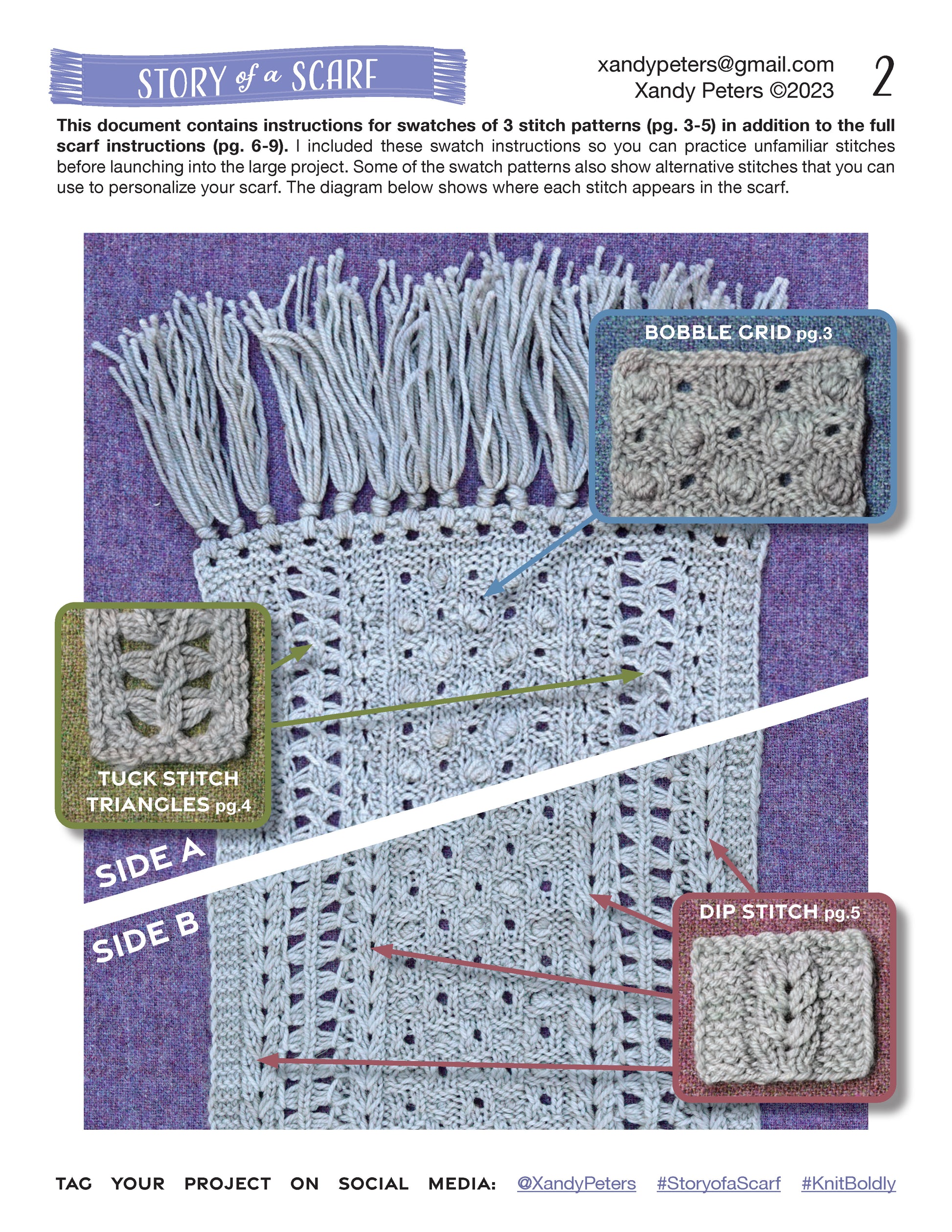 This listing is for a pattern download from XandyPeters.com. If you want this pattern added to your Ravelry library, please follow this link to purchase directly from Ravelry This scarf was designed for Knit Stars Season 7 as part of the Story of a Swatch Class. The goal of the project was to create a textured scarf that looks good on both sides, lies flat, and uses less than 3 skeins of MollyGirl Yarn Rockstar DK. The resulting scarf combines a wide variety of textured stitches and openwork from the design portion of the class.