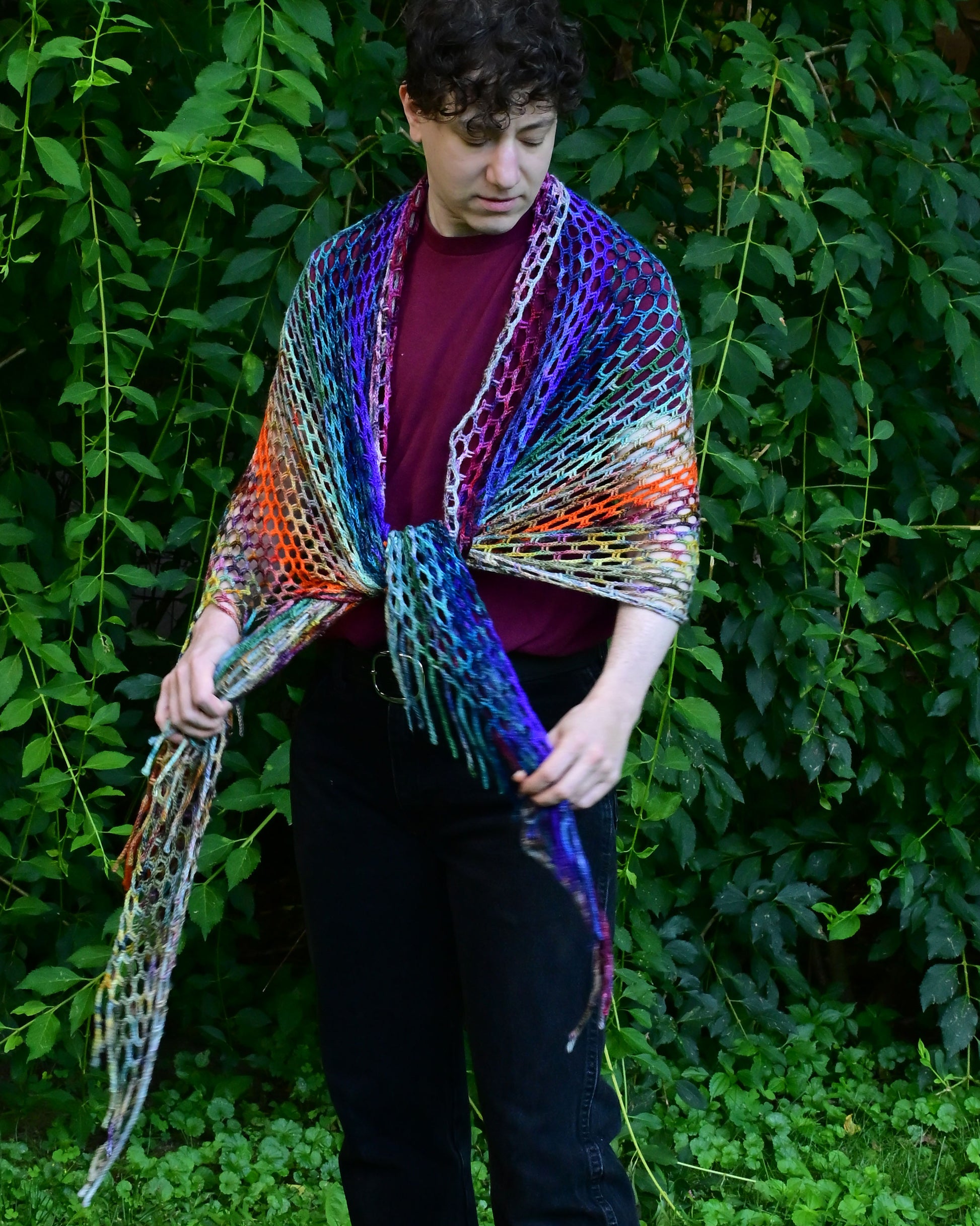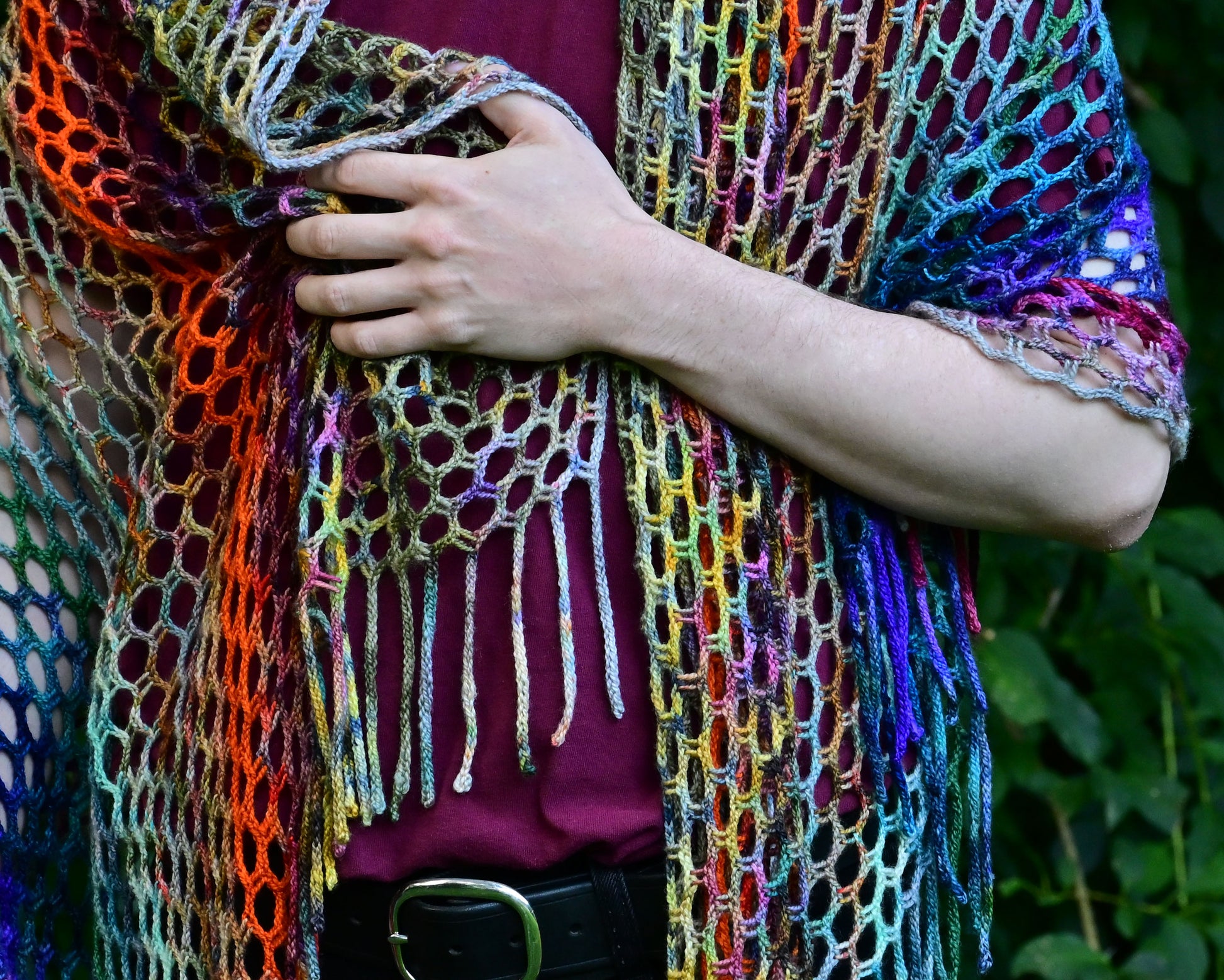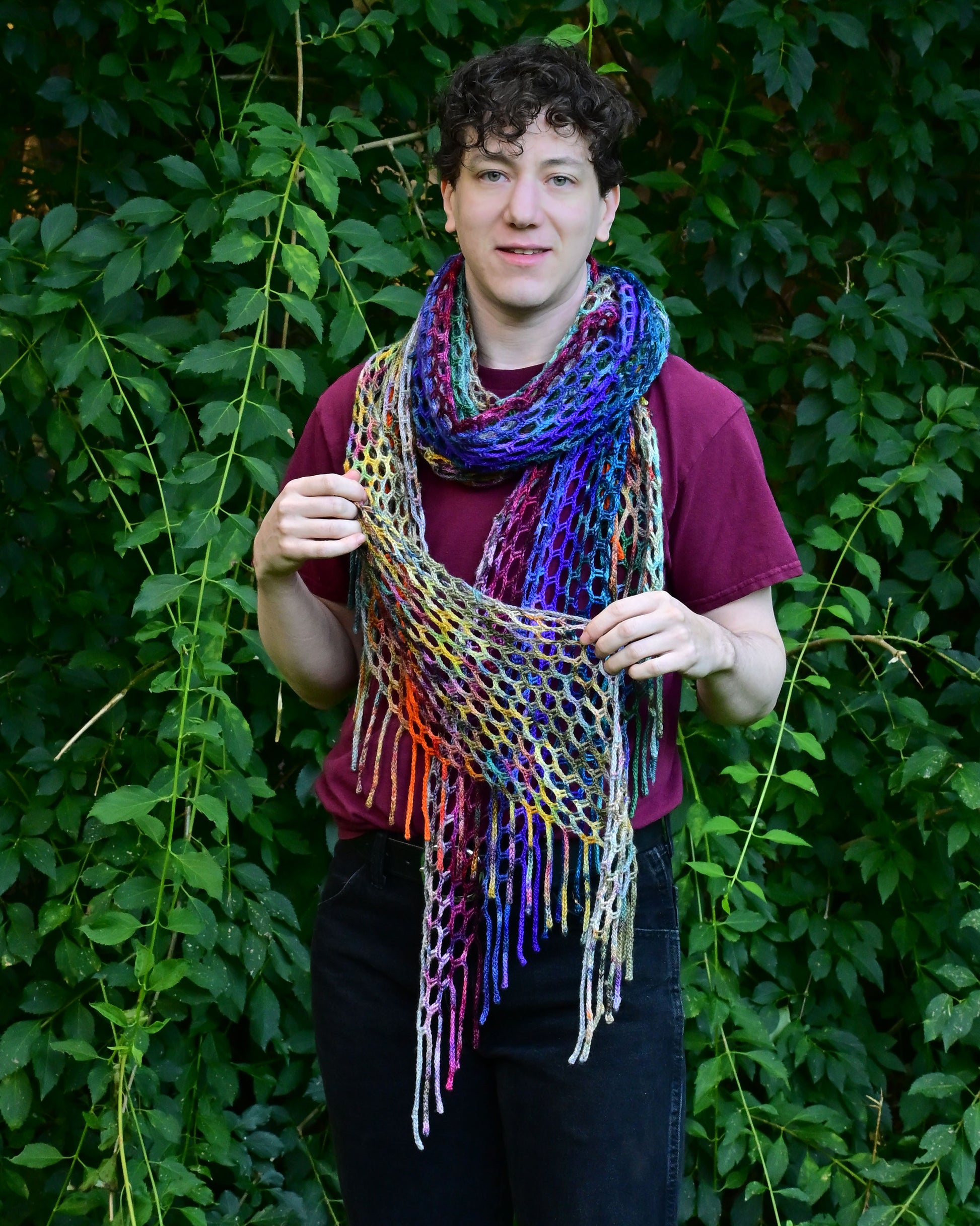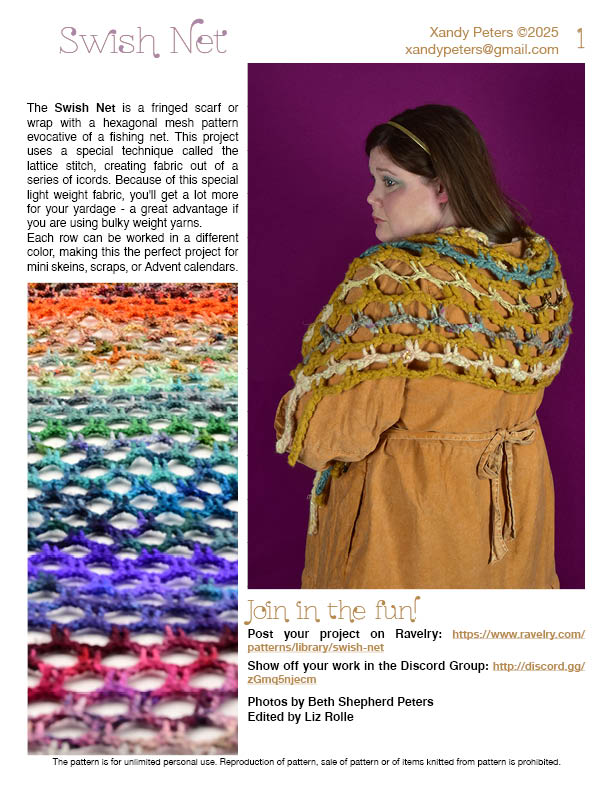 The Swish Net is a fringed scarf or wrap with a hexagonal mesh pattern evocative of a fishing net. This project uses a special technique called the lattice stitch, creating fabric out of a series of icords. This stitch is also known as faux-chet because it so closely resembles various crochet stitches. This unusual construction makes the fabric somewhat unlike most other types of knitting. Dropped stitches do not ladder, but that also means you can’t fix a mistake without ripping back to that spot. Each row takes a while to knit, but there are far fewer rows in each project than there would be in a more traditional stitch. The mesh fabric has a variable gauge. The openwork stitches allow the length and width of the project to shift freely. The same size project can be worn as a long, narrow scarf or a short, wide shawl.