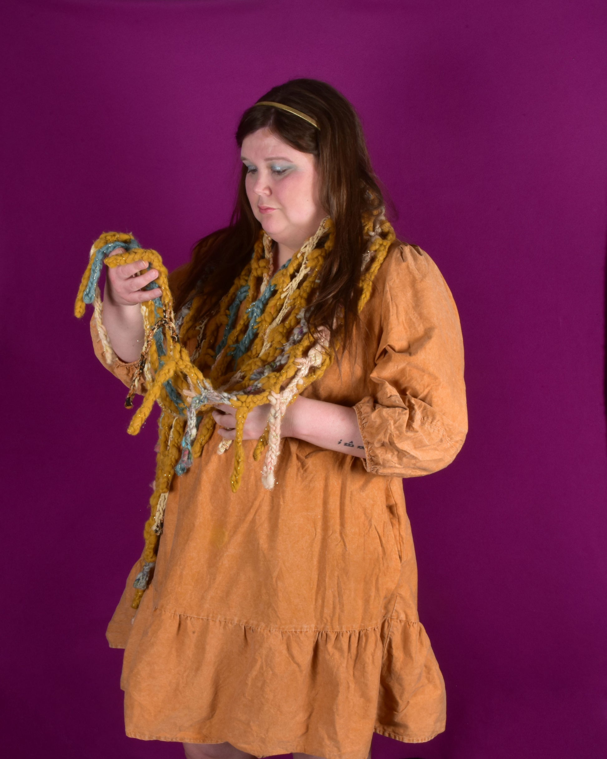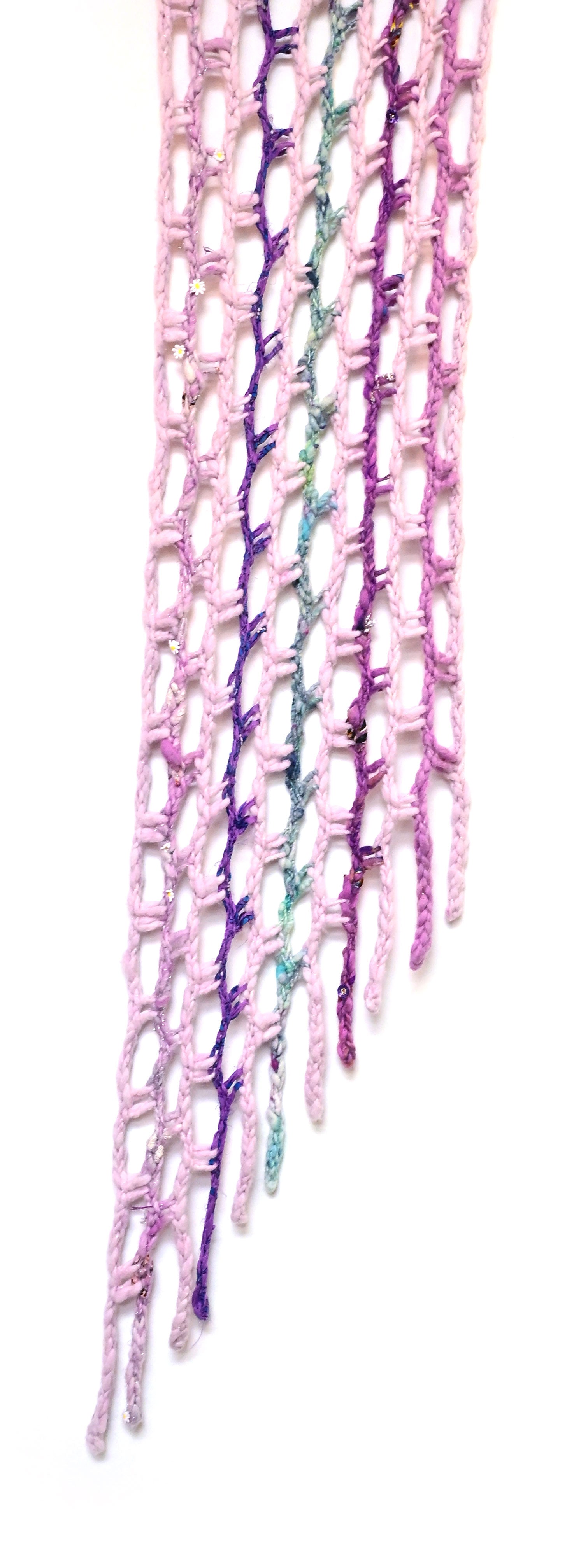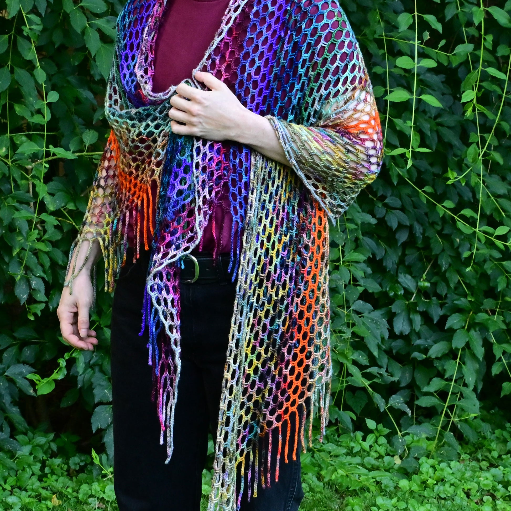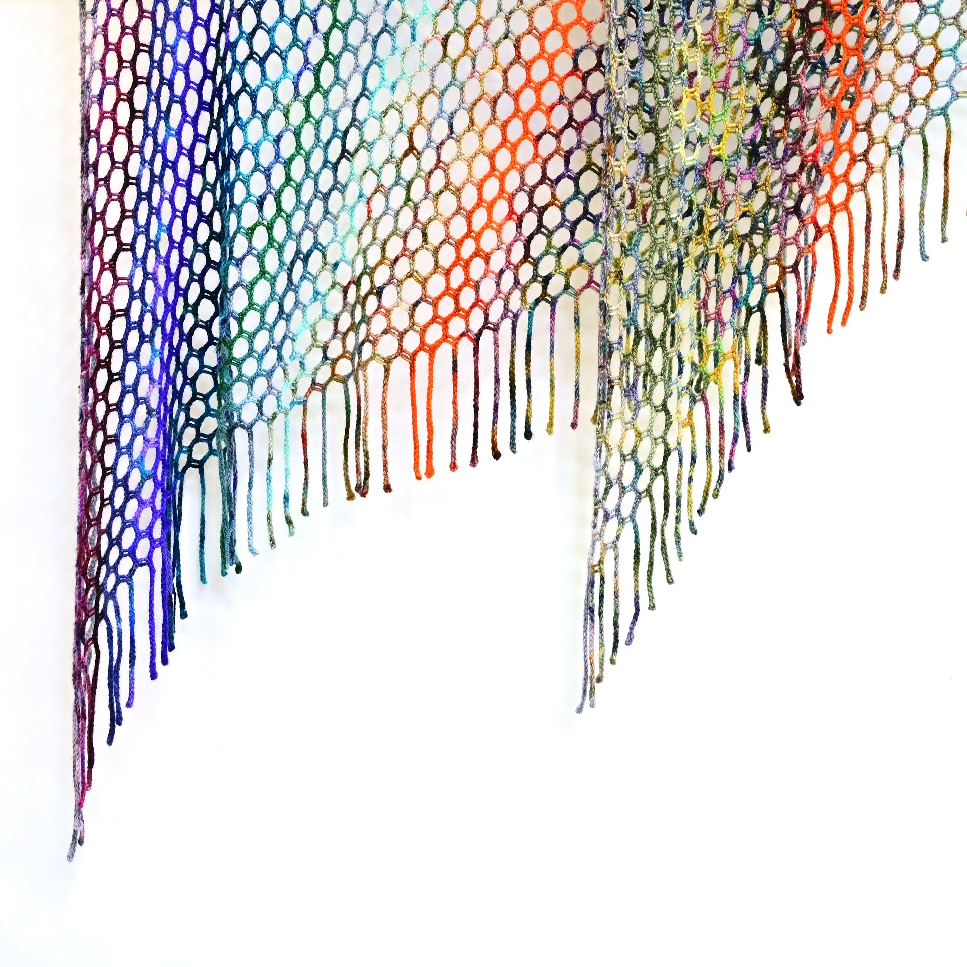 The Swish Net is a fringed scarf or wrap with a hexagonal mesh pattern evocative of a fishing net. This project uses a special technique called the lattice stitch, creating fabric out of a series of icords. This stitch is also known as faux-chet because it so closely resembles various crochet stitches. This unusual construction makes the fabric somewhat unlike most other types of knitting. Dropped stitches do not ladder, but that also means you can’t fix a mistake without ripping back to that spot. Each row takes a while to knit, but there are far fewer rows in each project than there would be in a more traditional stitch. The mesh fabric has a variable gauge. The openwork stitches allow the length and width of the project to shift freely. The same size project can be worn as a long, narrow scarf or a short, wide shawl.