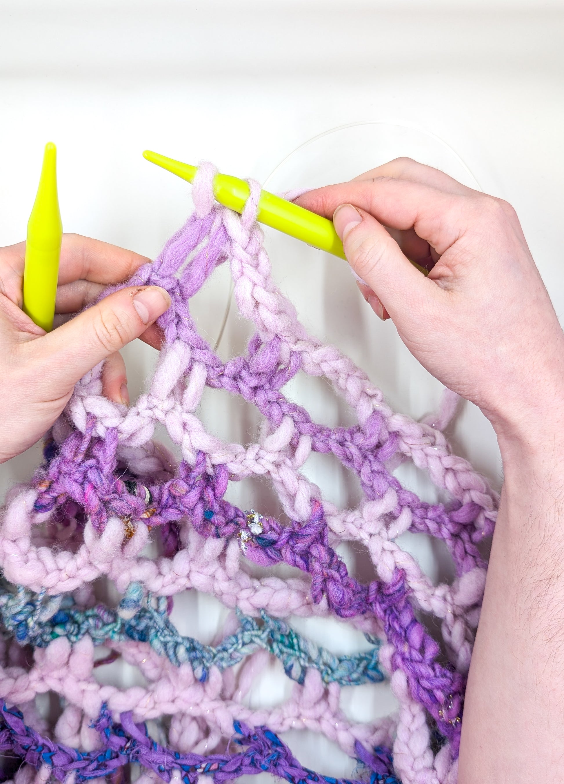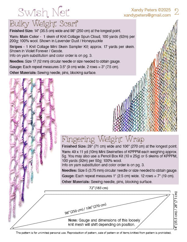 You'll get a lot more for your yardage compared to similar stitches in crochet or even other knit stitches because of this special light weight fabric,. Bulky weight yarns tend to eat up a lot of yardage, but this pattern is designed to take your yarn much further. Each row is worked in a different color, making this the perfect project for mini skeins, scraps, or Advent calendars. I love how the bulky weight versions use mini skeins of KnitCollage art yarn. You hardly need any Koigu KPPPM to complete a row. If there's a yarn that you love to use and you have a bunch of scraps, you can probably make a swish net with them.Depending on what yarn you choose, you can wear this pattern in any season. Thicker yarns work better for the winter.