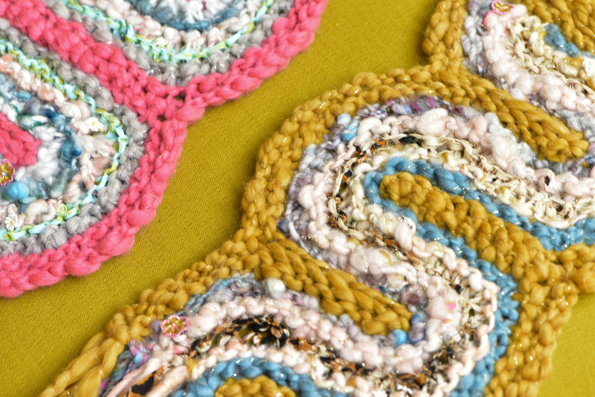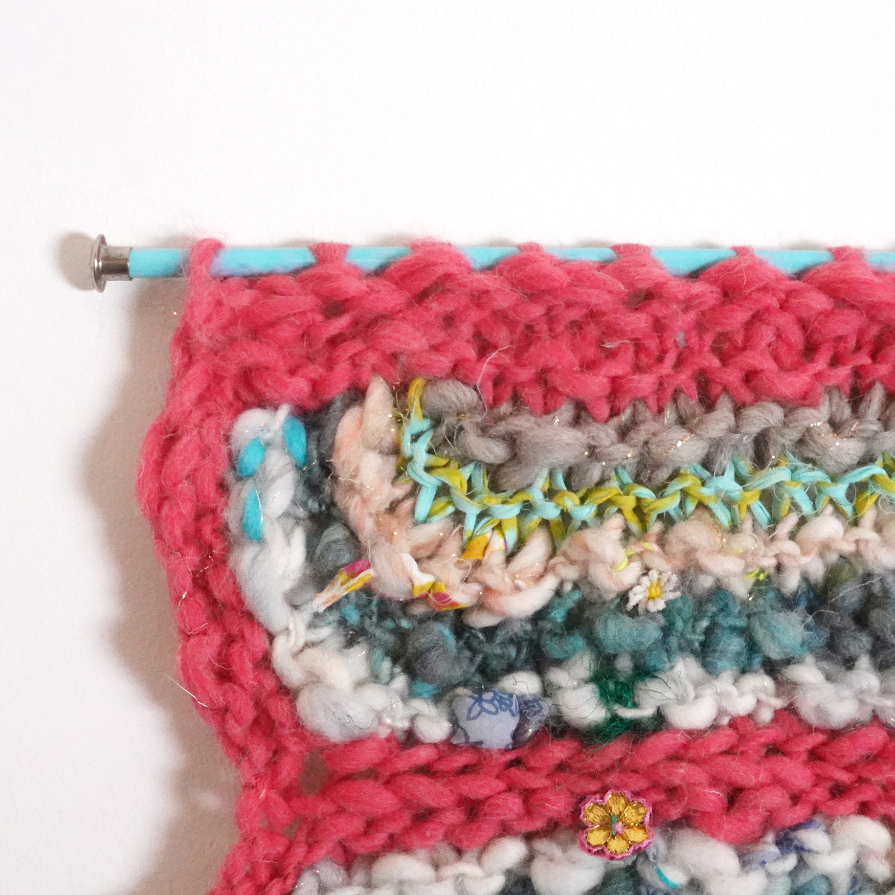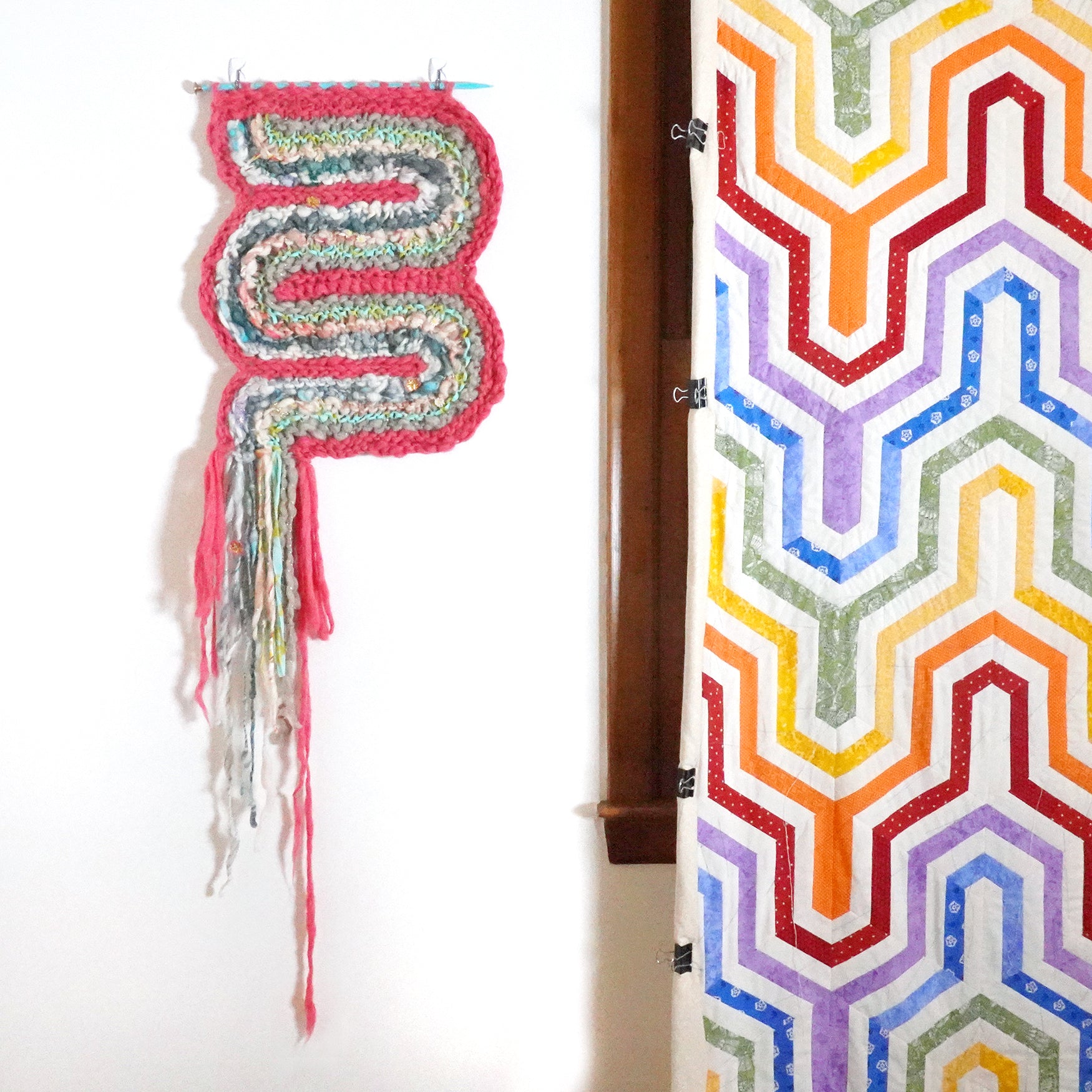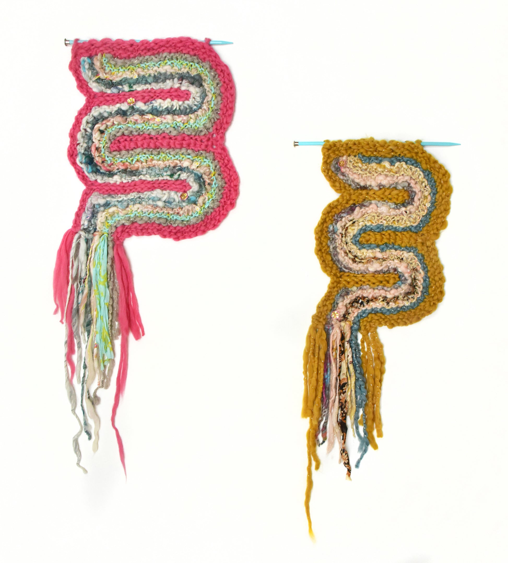 This simple project is a beginner level stacked stitch project that will help you become familiar with the technique. It features stripes of wavy colorwork, a fringed edge, and a dowel for hanging.